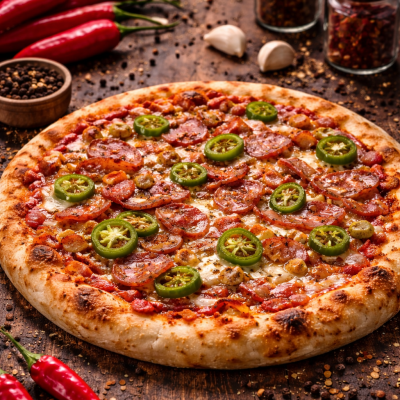 1. sos pom 2. ser mozzarella 350g/150g 3. pieczarki 40g/20g 4. papryczki jalapeno 50g/25g 5. boczek 80g/40g 6. szczypta oregano 7. pieprz