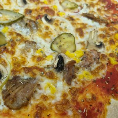 Sos pom 2. ser mozzarella 350g/15og 3.mieso stek 100g /50g 4.cebula 20g/10g 5.ogórek konserwowy 20g/10g 6.kukurydza 20g/10g 7.pieczarki 50g/25g 8. szczypta oregano