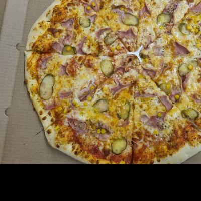 Sos pom 2.ser cheddar 50g/25g 3.ser mozzarella 300g/150g 4.szynka 40g/20g 5.boczek 40g/20g 6.ogorek konserwowy 30g/15 7.kukurydza 20g/10g 8.oregano