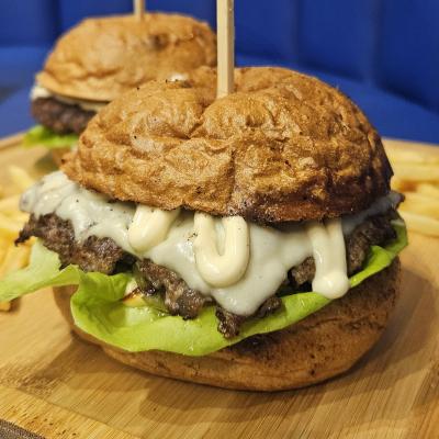 110g wołowiny lub 100g kurczak/ bułka 70g/ cebula/ sałata/ ogórek konserwowy/ musztarda/ keczup/ majonez