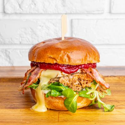 Szarpana wieprzowina 120g, dżem z żurawiny, camembert, boczek x2, rozpszonka, sos firmowy z parmezanem.