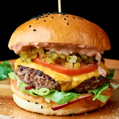 Mięso wołowe (160 g), sos firmowy, cheddar, ogórek kiszony, pomidor, sałatka, aromatyczna marynowana cebula.