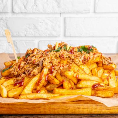 Frytki belgijskie 400g, Szarpana wieprzowina 120g, Cheddar topiony, sos BBQ.