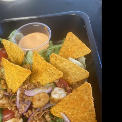 Rukola, kurczak, pomidor, cebula prażona, nachosy, sos paprykowy