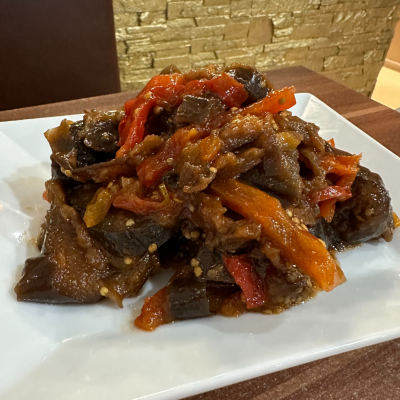 Domowa pasta z duszonego bakłażana i papryki, pikantna i bardzo aromatyczna.