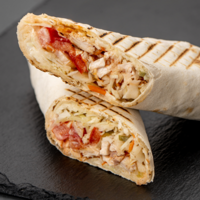 Kebab z falafel, warzywami oraz marchewką po koreańsku i pelyustką.