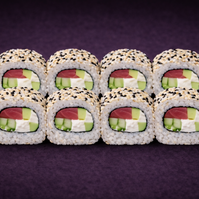Ryż, nori, ogórek, tuńczyk, awokado, majonez japoński, sezam
