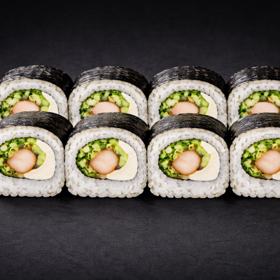 Ryż, nori, serek, kurczak wędzony, ogórek, sałata lodowa
