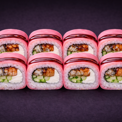 Ryż, papier sojowy, nori, serek, węgorz, ogórek, sos unagi