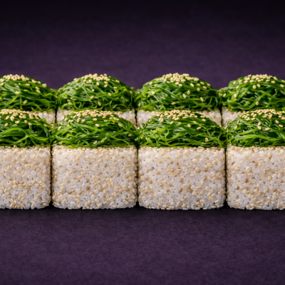 Ryż, nori, serek, ogórek, sałatka chuka wakame, sezam