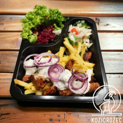Gyros z kurczaka z ziemniakami lub frytkami i świeżymi surówkami
