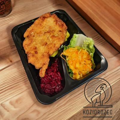 Panierowany kotlet z piersi kurczaka z dodatkami i surówkami