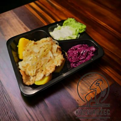 Stek ze schabu z cebulką, ziemniaki lub frytki, świeże surówki