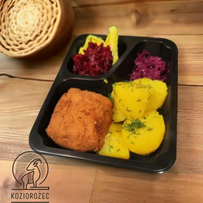 Zawijaniec słupski z serem i boczkiem w panierce, dodatki i surówki