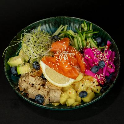 Ryz, łosoś lekko słony, mango, daikon, awokado, ogórek, tamago, dressing miodowo-cytrynowy, sos sojowy, sezam