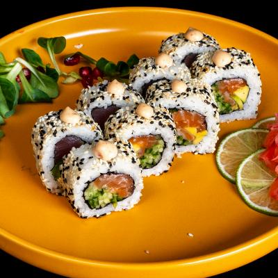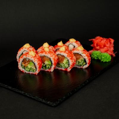 Ryż, nori, łosoś lekko słony, masago albo sezam , ogórek, spicy, awokado