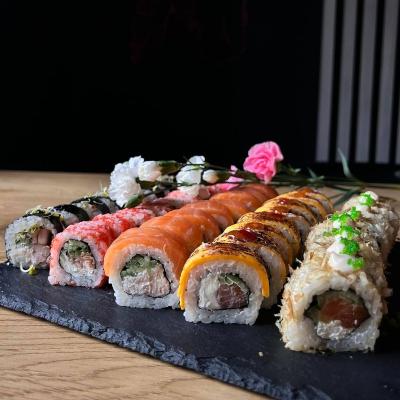 8x California Grill, 8x Sake Bonito Roll, 8x Phila Yasashi, 8 xFusion cheese roll, 10x Futomaki z kurczakiem