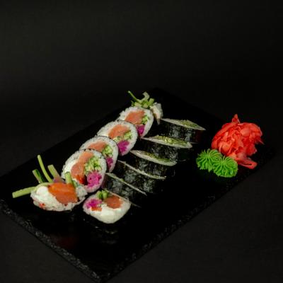 Ryż, nori, Philadelphia, łosoś wędzony, ogórek, papryka, daikon