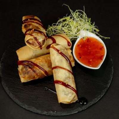 4 sztuki pysznych, chrupiących sajgonek z krewetką, robione na miejscu.