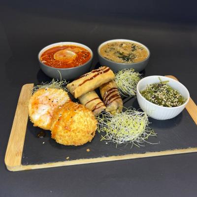 Zupa, sajgonki z łosośiem grill, temari z krewetką, salatka