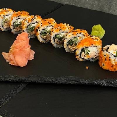 Łosoś grillowany, ogórek, tobiko, phila, sezam, ryż, nori.