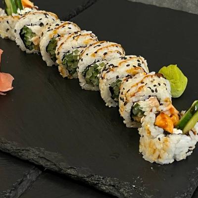 Phila, sezam, łosoś grillowany, ogórek, ryż, nori.