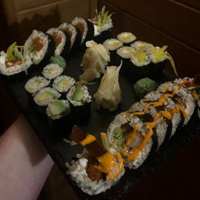 Maki z łososiem 6szt., Maki z awokado 6szt., Futomaki z łososiem 6 szt., Futomak Fry z krewetką 6szt.