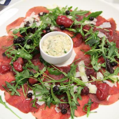 Z żurawiną, musem z czeremchy, rukolą, parmigiano reggiano oraz sosem tuńczykowym