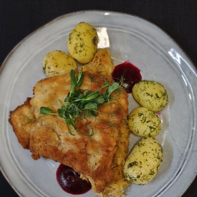 Z kością na zasmażanej kapuście, z ziemniakiem z wody oraz puree z buraka