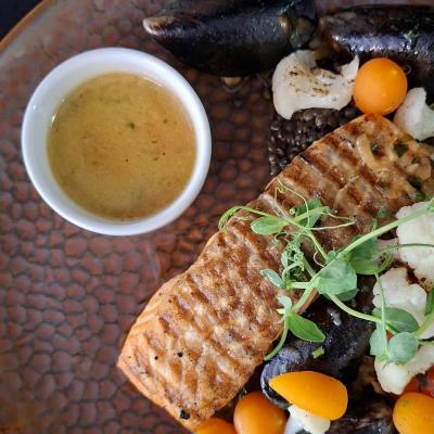 Pieczony podany na czarnej soczewicy z fasolką edamame, palonym kalafiorem oraz sosem winno-maślanym