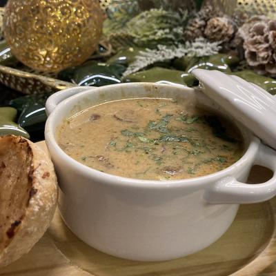Na zakwasie z kapusty, z łazanką oraz chrupiącą brioszką zapieczoną z konfiturą czosnkową oraz żurawiną