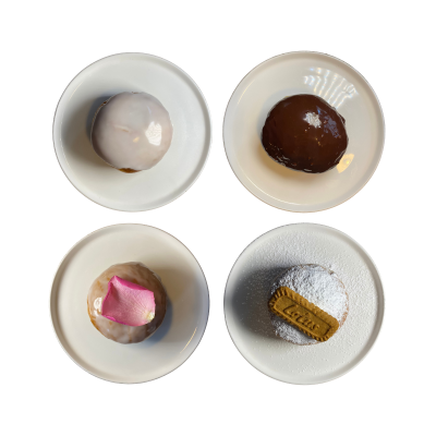 4 sztuki po jednym z każdego rodzaju z naszej tegorocznej oferty: 1 szt. klasycznego pączka z powidłami, 1 szt. pączka z nadzieniem budyniowym, 1 szt. Pączka różanego oraz 1 szt. Pączka z kremem na bazie ciasteczek Lotus.