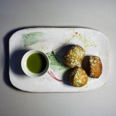 Gorące, smażone drożdżowe pączusie ze słodkim mleczkiem skondensowanym z dodatkiem matchy.