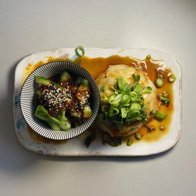 Gotowane na parze delikatne płaty pszennego ciasta wonton przełożone warstwowo aromatycznym roślinnym mielonym z nutą imbiru, naszym olejem chili i sosem sojowym oraz świeżą kolendrą. Całość intensywna w smaku, lekko pikantna, podawana z dodatkiem chrupiących ogórków w kwaskowym sosie chili z czosnkiem.